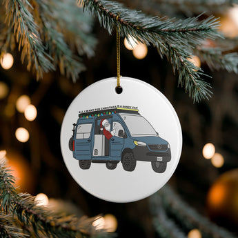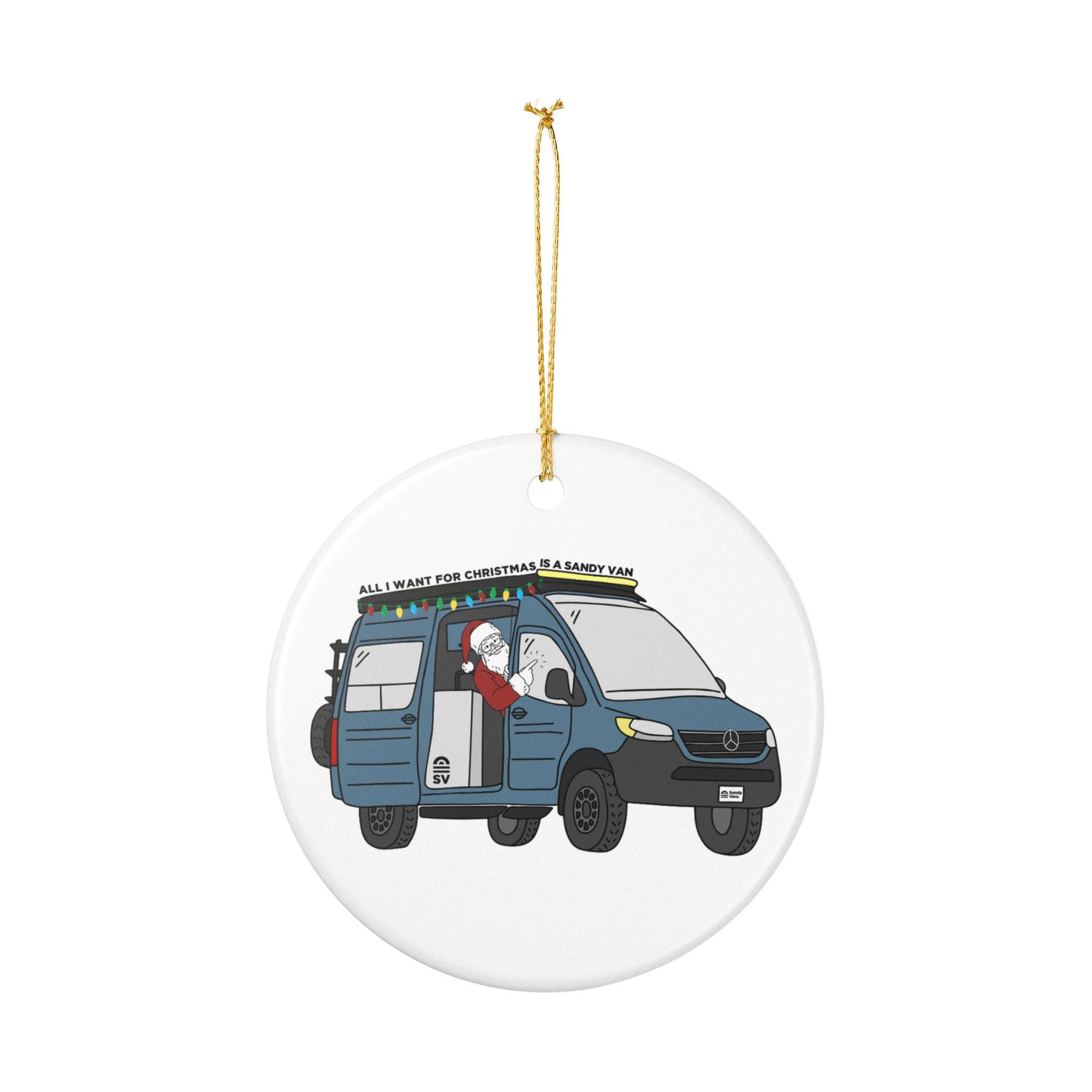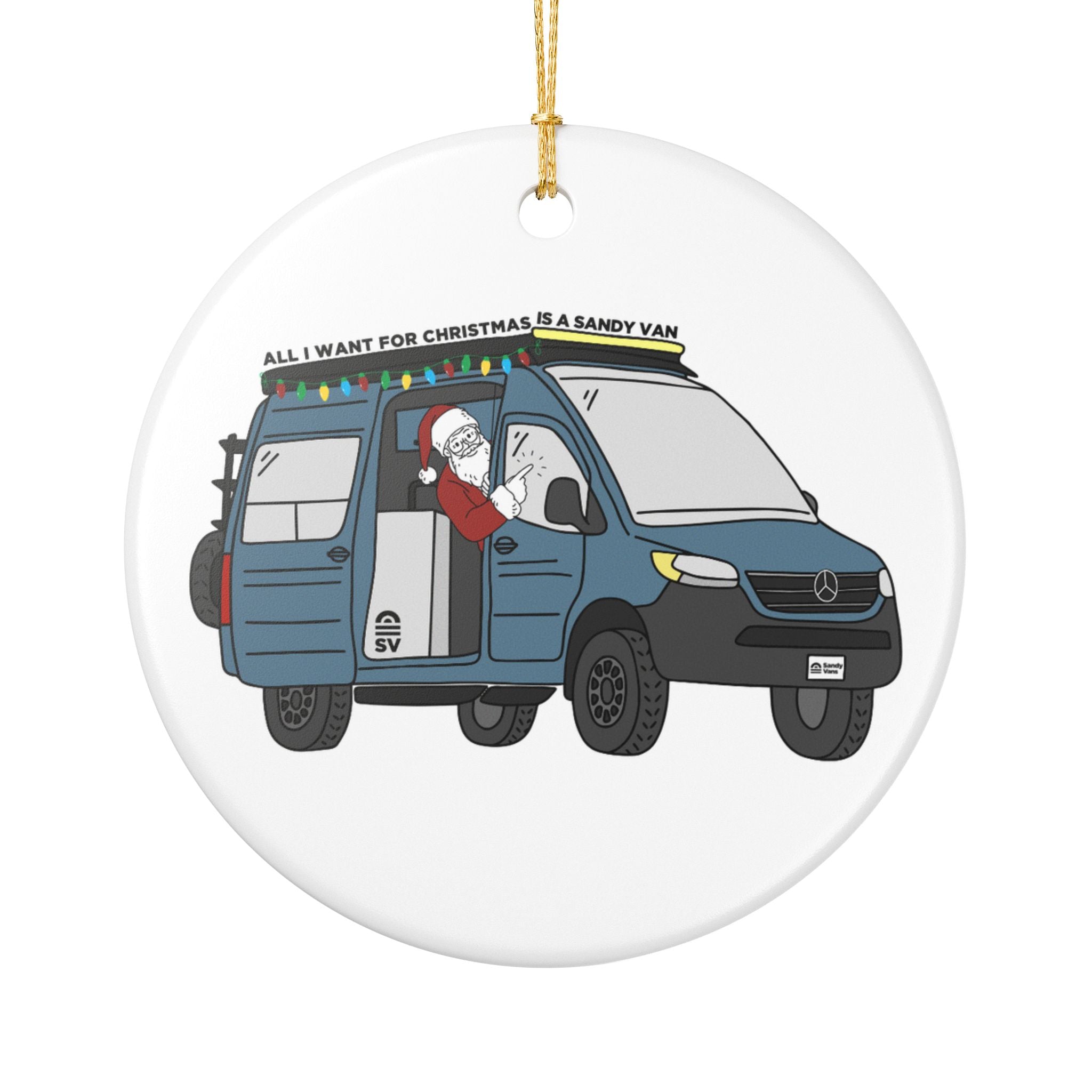 Santa Driving Camper Van Ceramic Ornament — "All I Want For Christmas Is A Sandy Van"