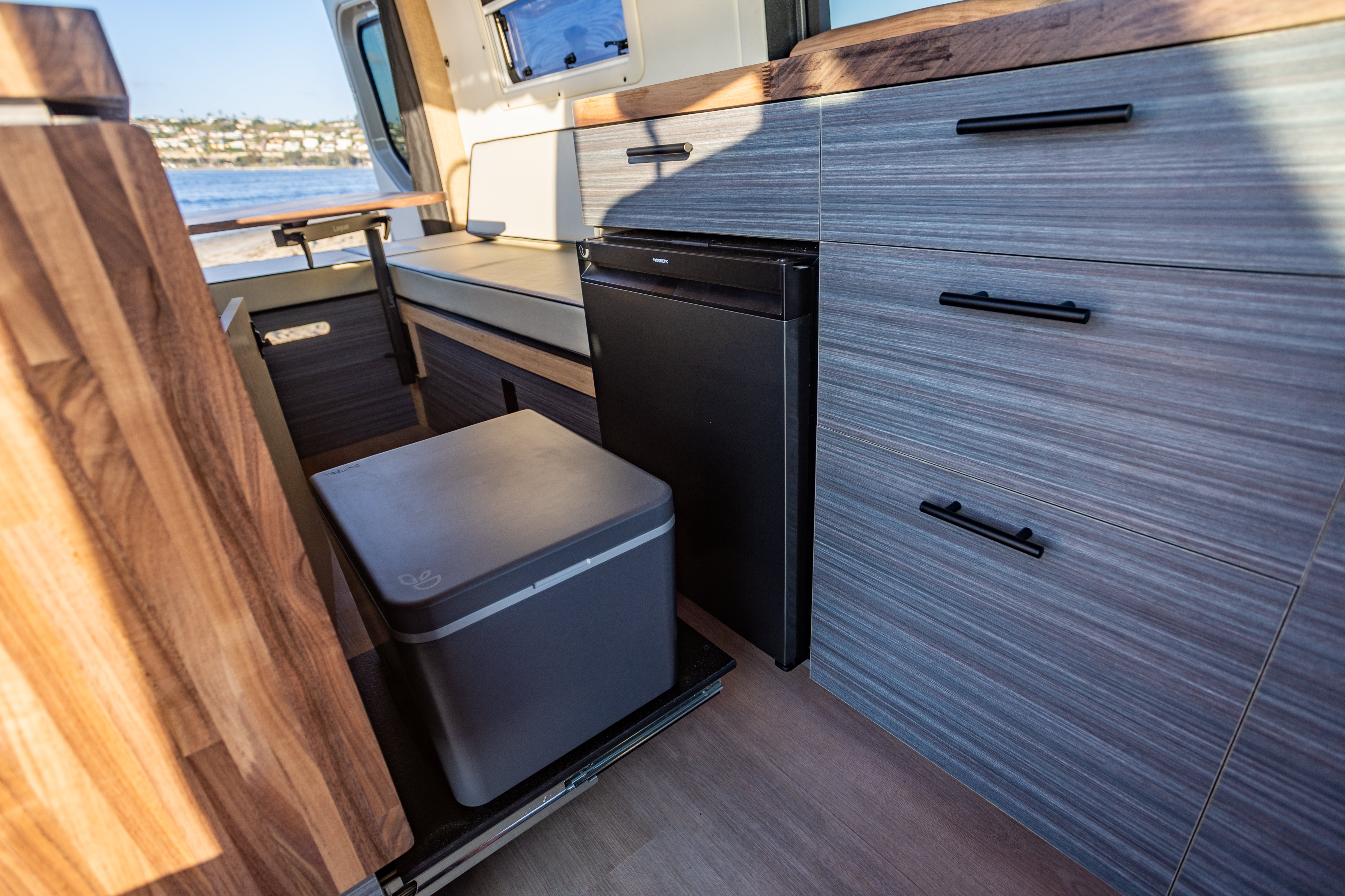 The 20 gallon fresh water tank under the passenger side bench seat provides water via pump/electric water heater to the sink & outdoor shower keeping you clean even if the rig isn’t. Again, further storage available under the sink as well as rear bench cubbies. Center divider is removable, which allows for rolling in a mountain bikes, dirt bike or that trusty SUP with easily accessible tie down via the wall L track system.