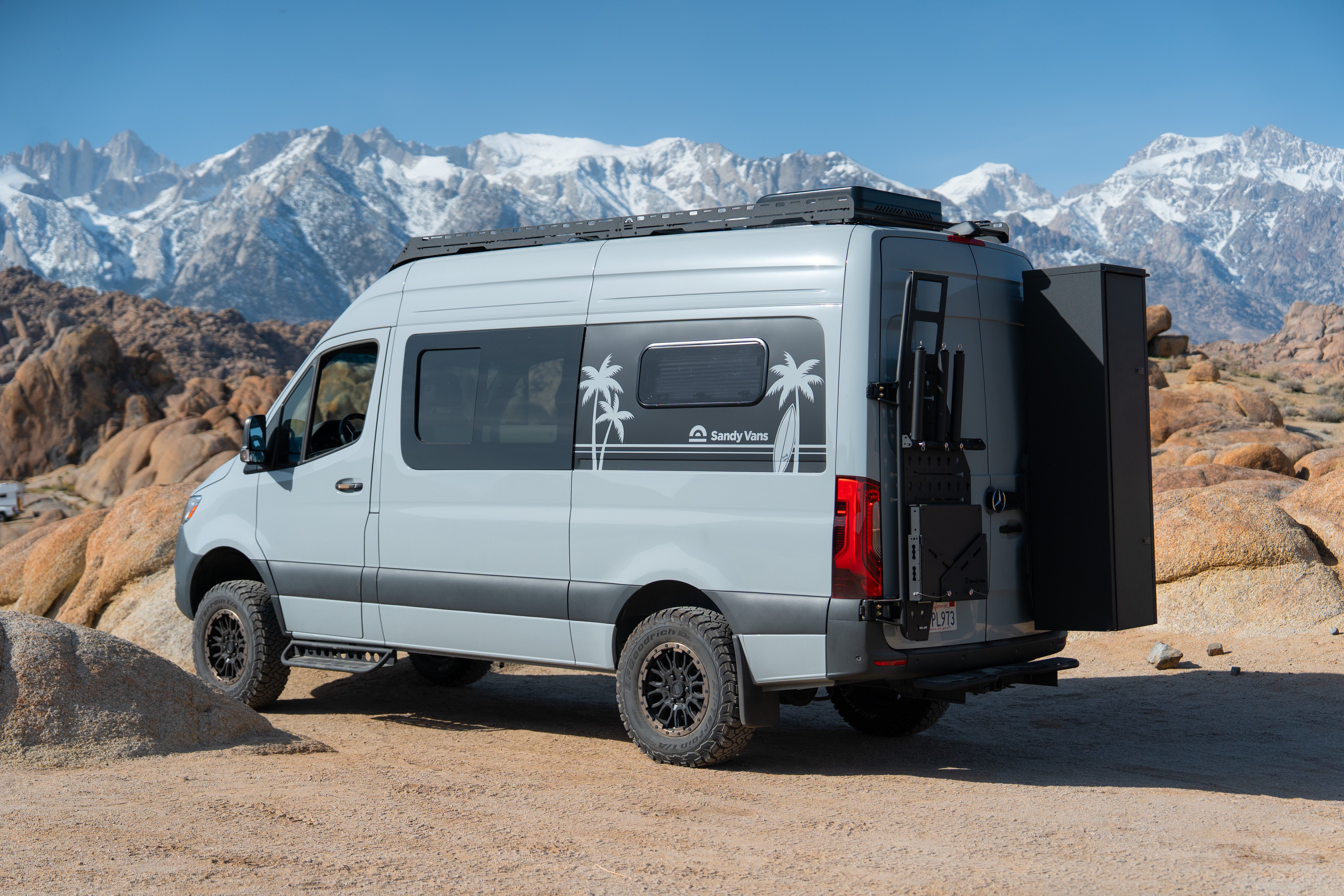 Outside, the Sandy Vans roof rack and SV side ladder expand your storage options, complete with a rooftop deck. The fully L-track-compatible setup allows you to mount extra gear like recovery boards, fuel cans, or adventure essentials. SV Canyon wheels paired with BFG KO3 all-terrain tires give AquaVan confident traction for wherever the road turns.
