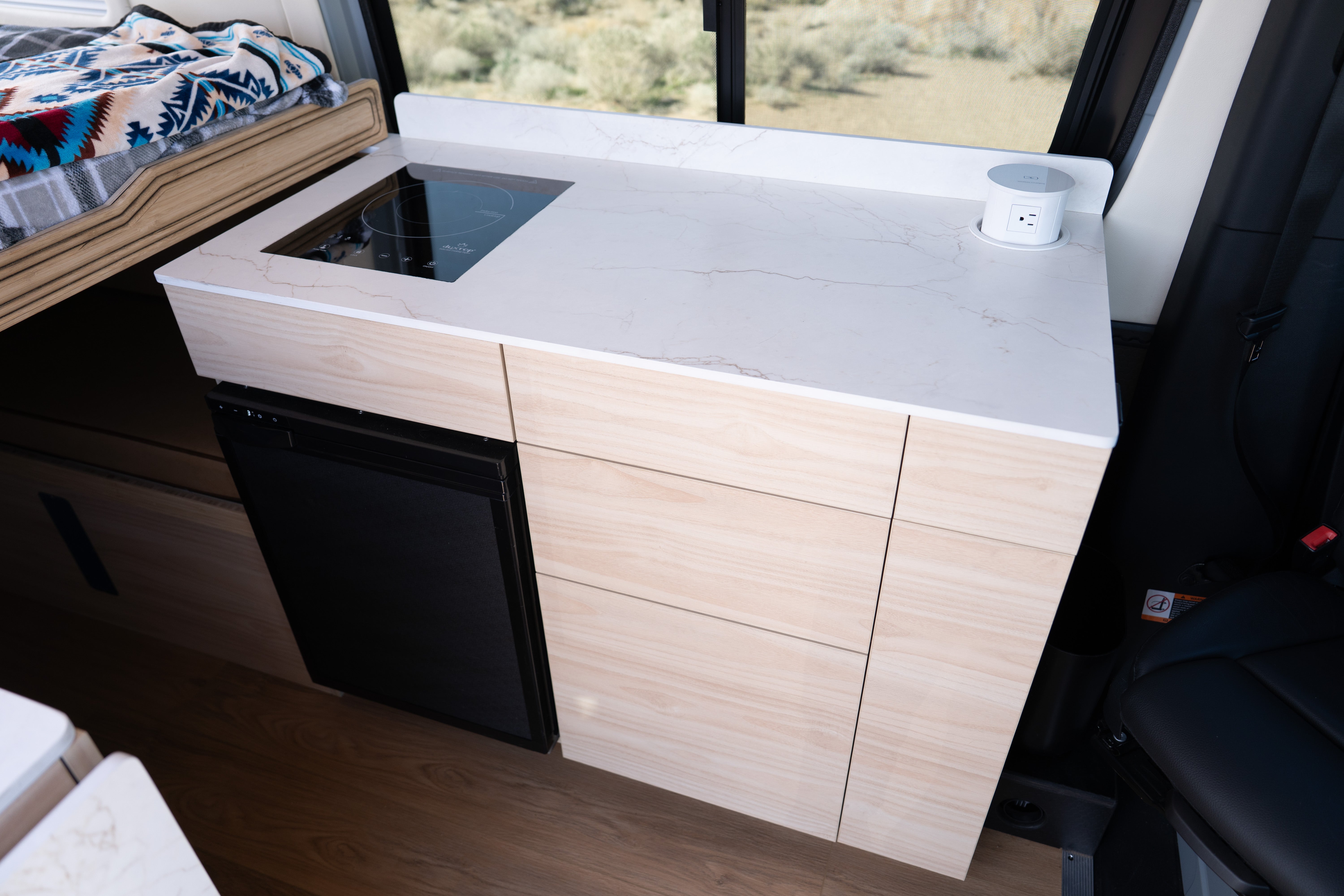 Designed for easy living on the road, AquaVan delivers the best of both worlds: a full dinette for meals, work, or downtime, plus a pull-out queen bed that slides seamlessly into place. Sleep north–south, stretch out comfortably, and still have space to settle in when the day winds down.