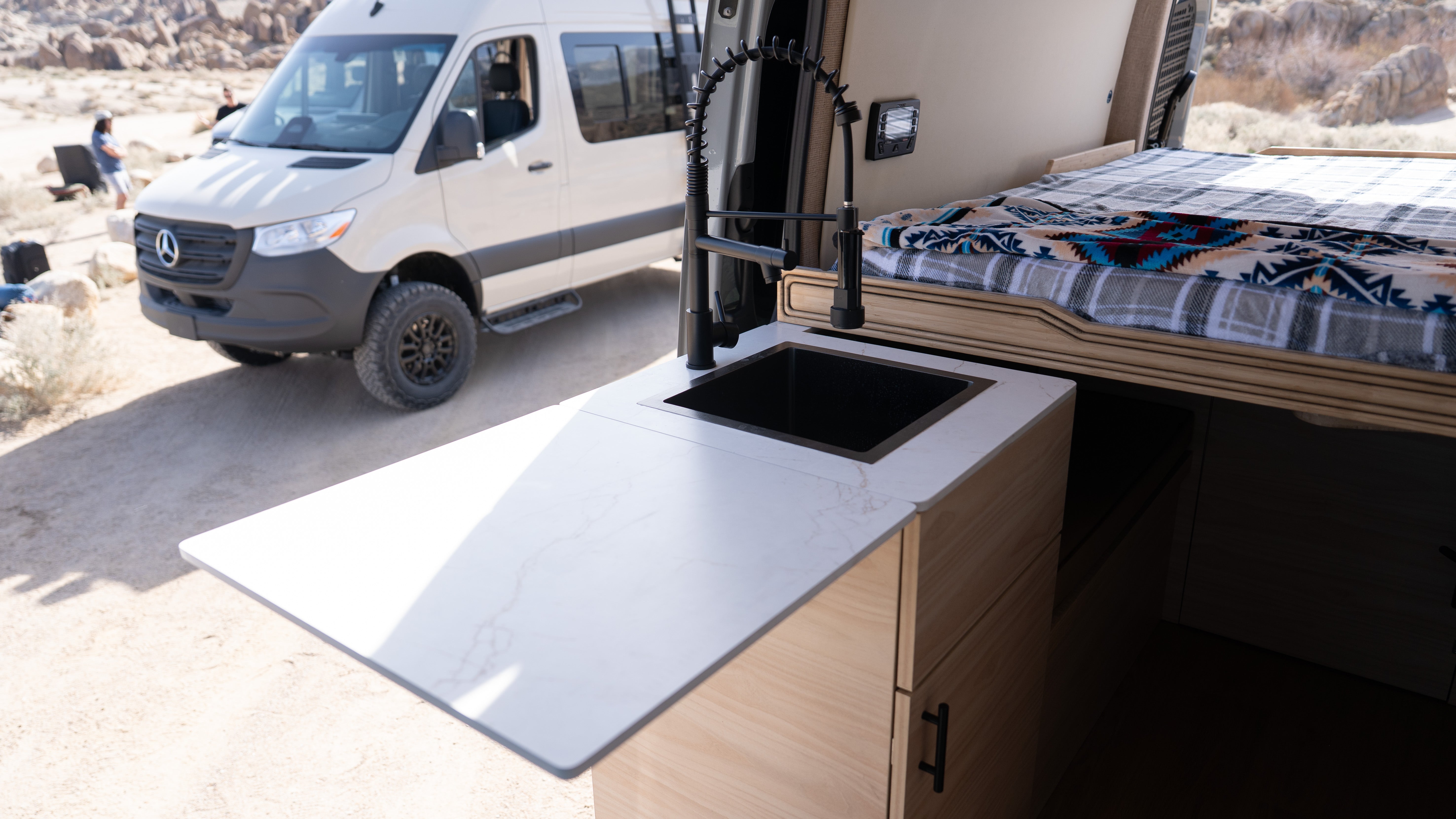 Triple-charge capability (solar, shore power, and alternator charging while driving) means AquaVan stays powered whether you’re posted up by the coast, exploring Baja, or heading into the mountains.