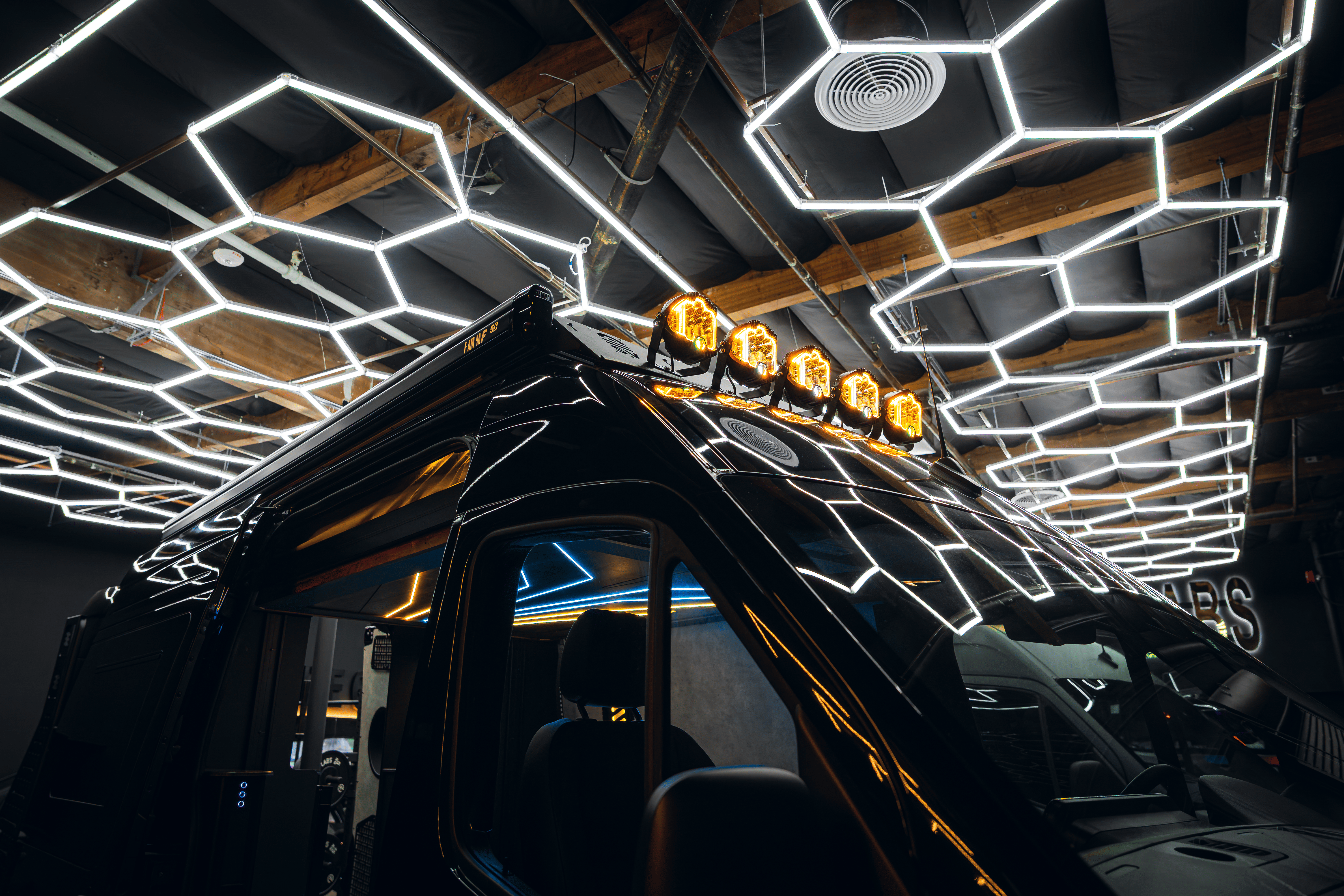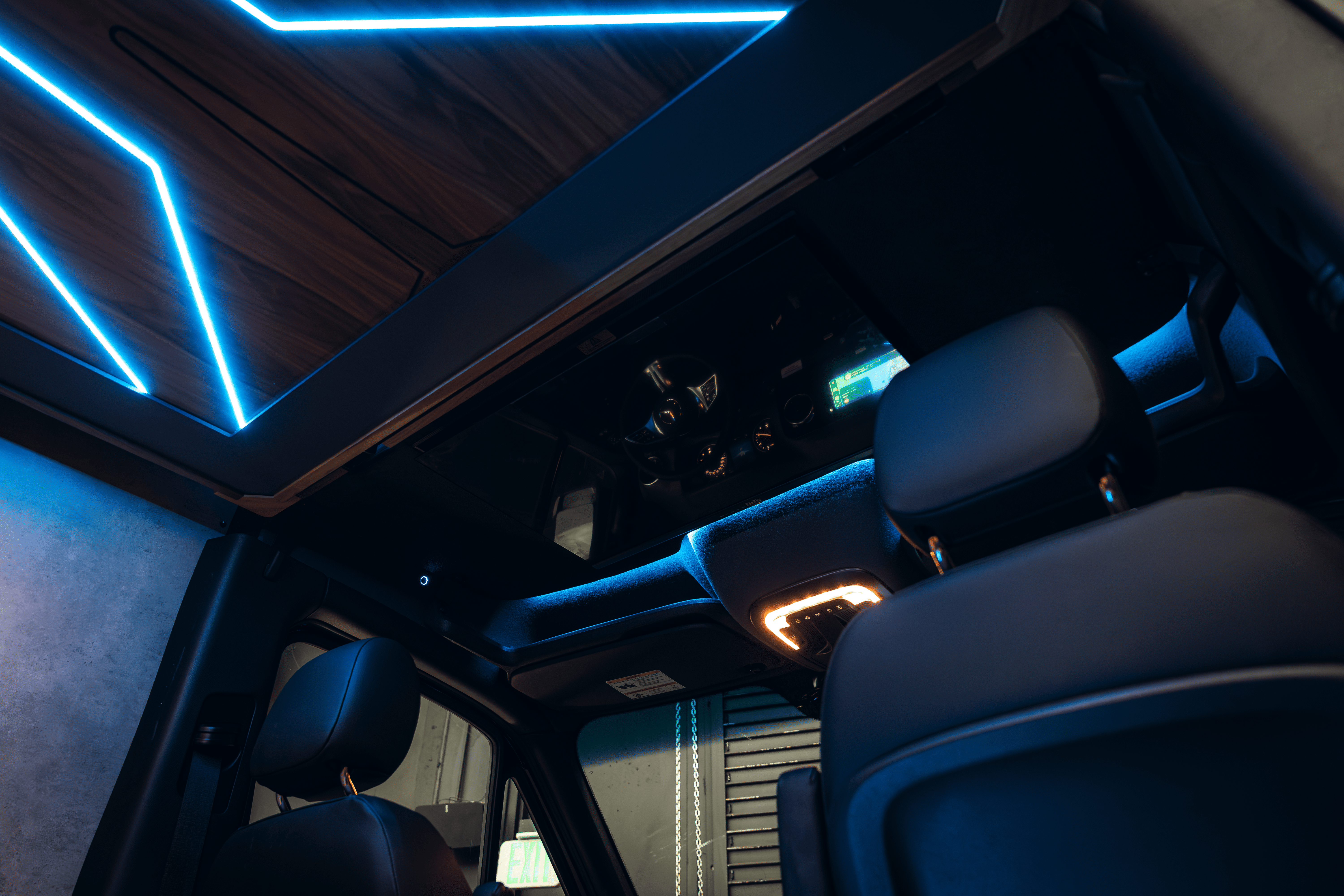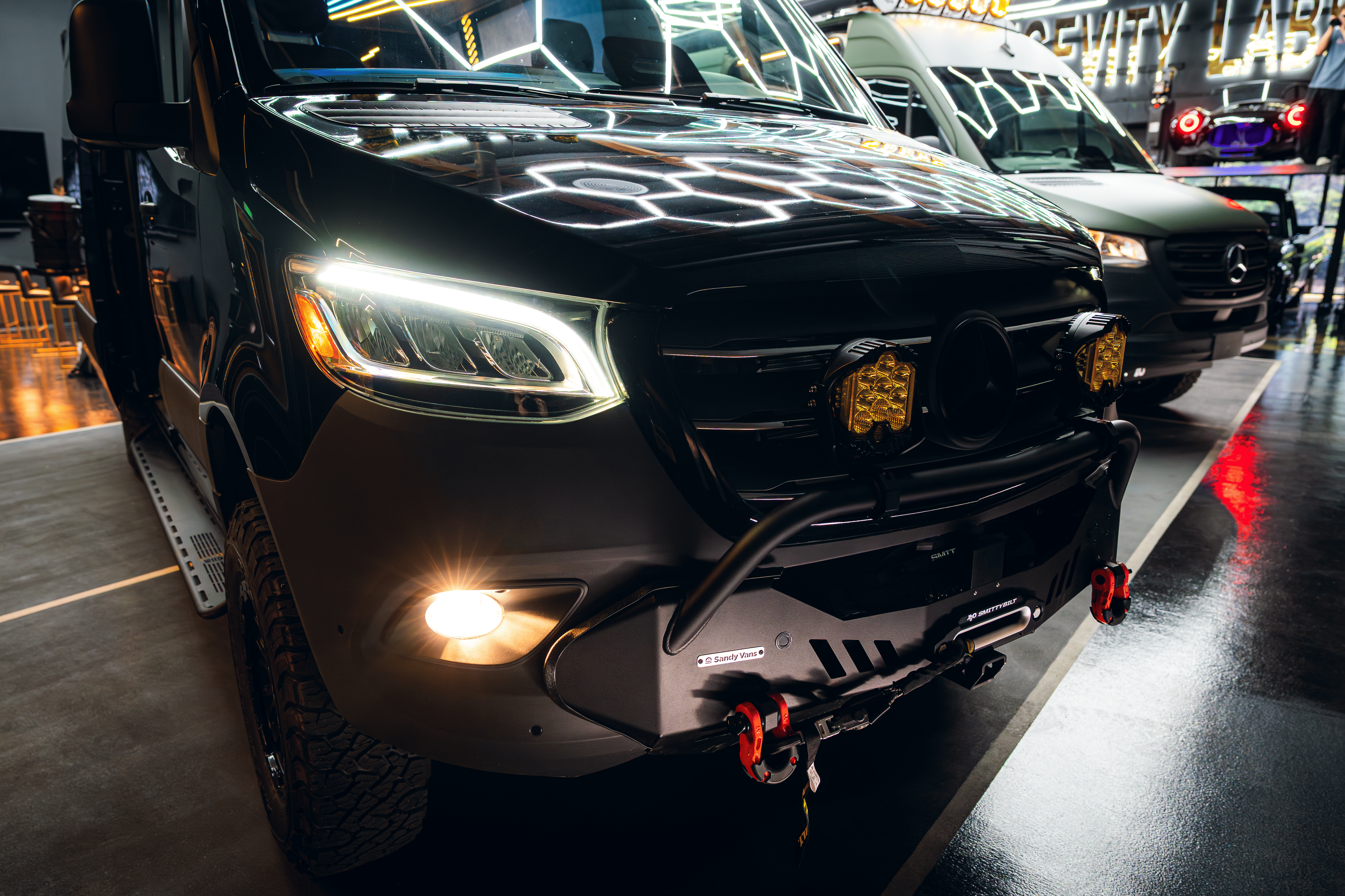 For lighting and visibility, the van features a full suite of off-road illumination, including a bull bar with integrated lights, roof-mounted off-road lights, a light bar, and perimeter lighting—perfect for nighttime camps or remote trail navigation.