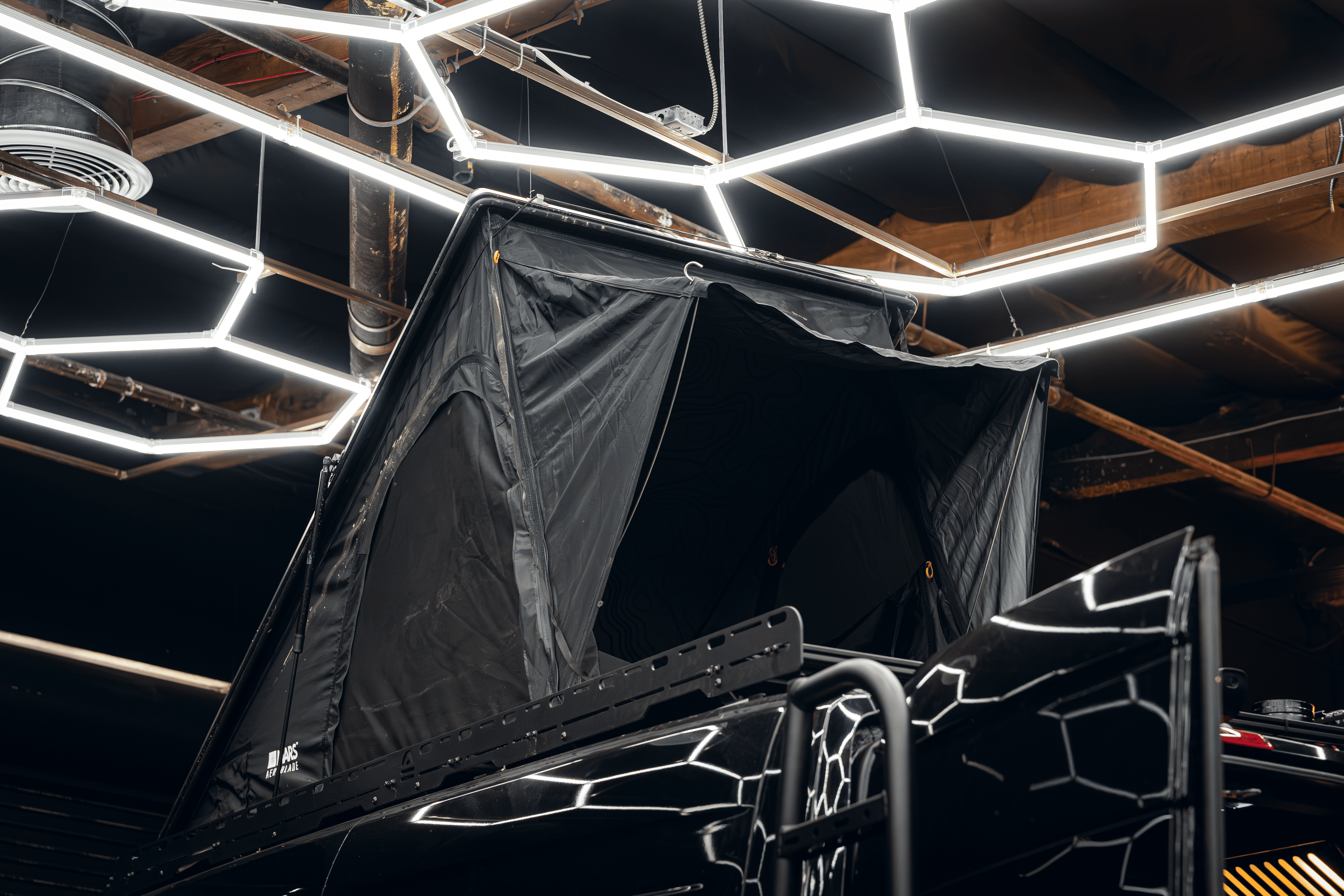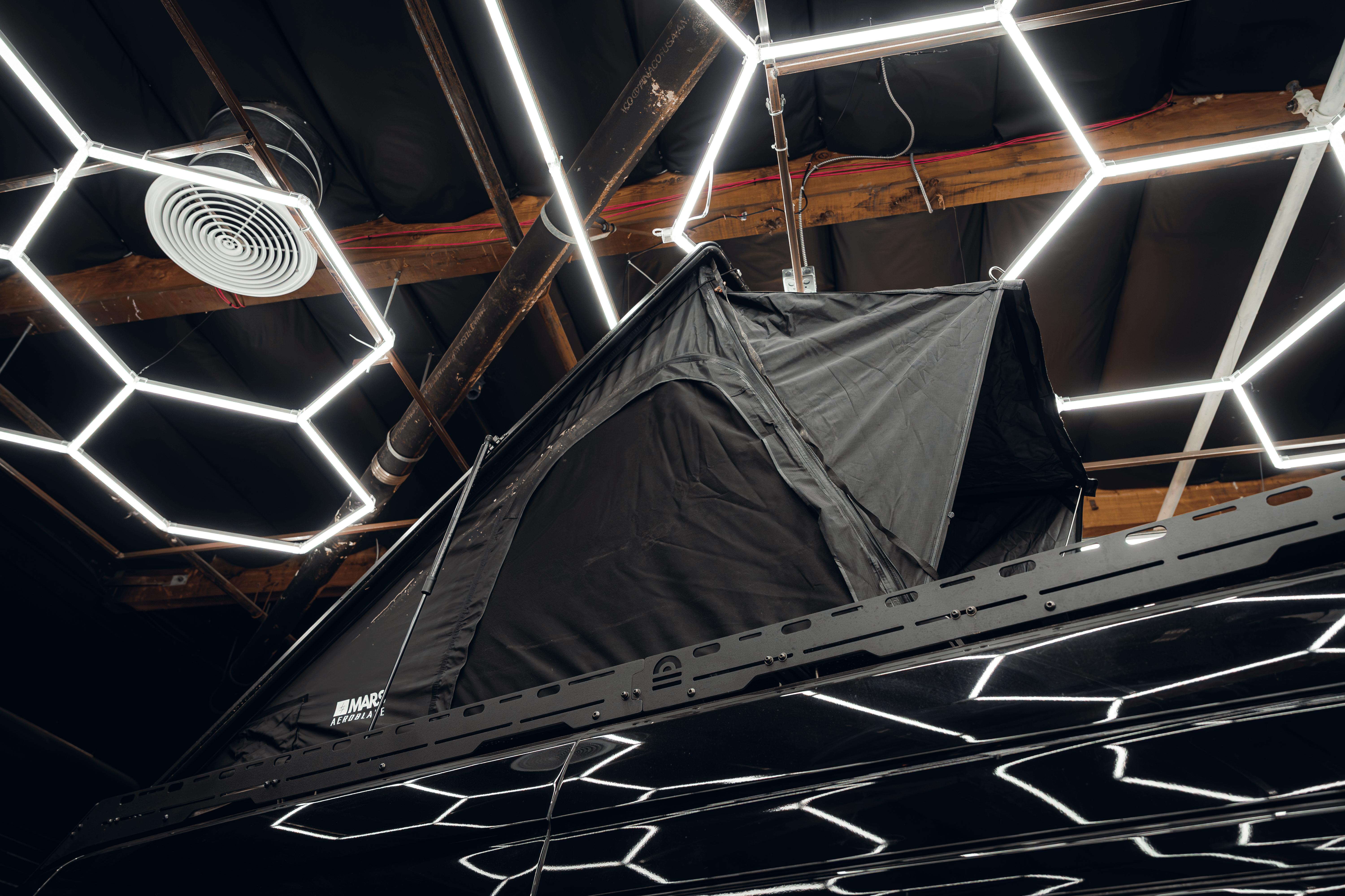 On the exterior, the Mothership is built to carry everything your adventure demands. Outfitted with the SV Sandbar Roof Rack, walkable roof decking, and a side ladder, the roof becomes a usable outdoor platform. Dual SV Starboard and Port racks support modular gear like the Boost Boxes, bike racks, and surfboard rack, while a spare tire system keeps you prepared for remote terrain.
